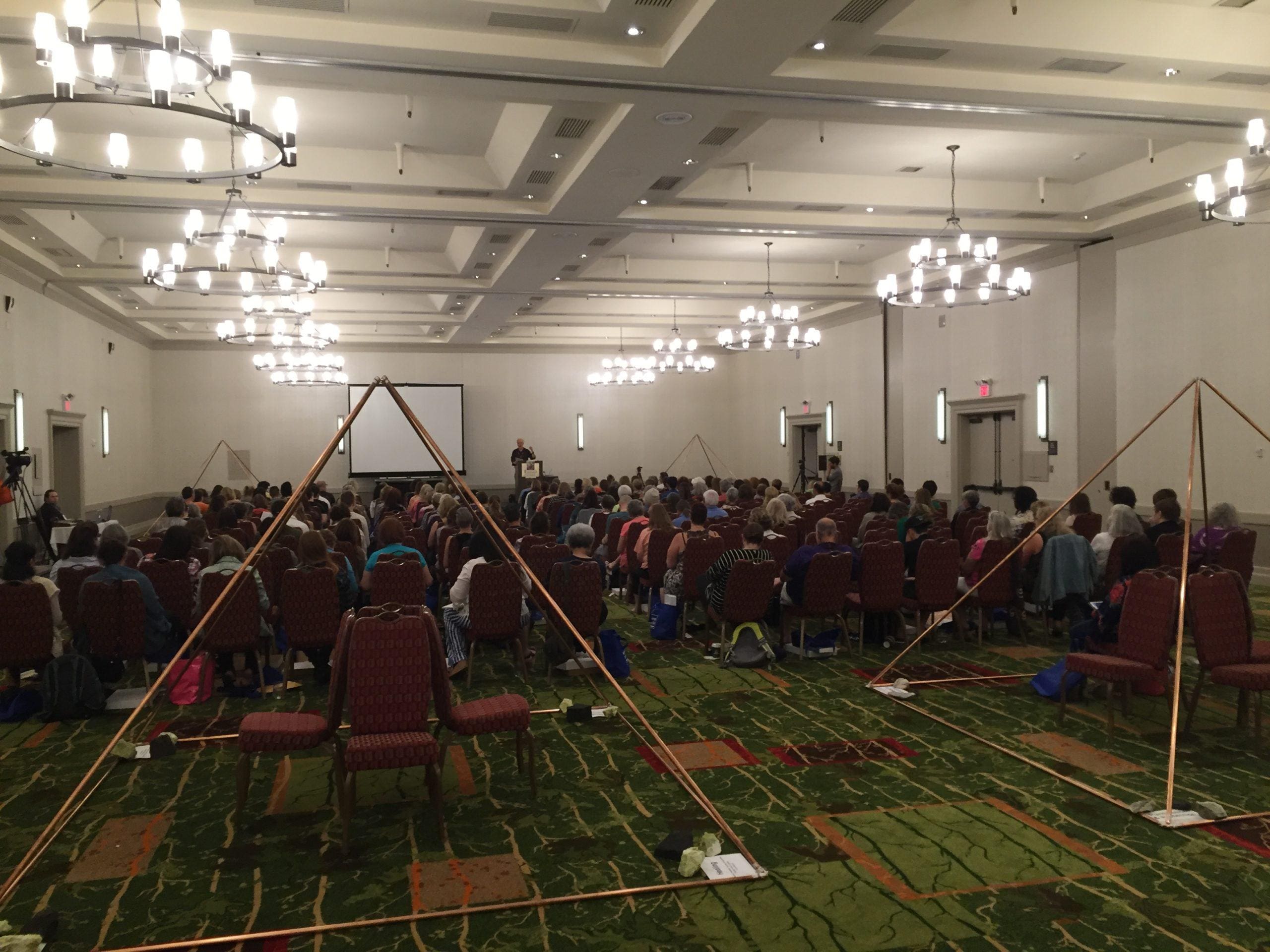 Let’s get right to it. There were 4 giant copper pyramids in each corner of the large auditorium – I believe they were 10×10 (around the base) and even 10 feet high (but don’t quote me on that). Each represented (the tubes were filled with, and on the floor inside them were featured appropriately chosen stones for) 4 key energies: Healing, Ascension, Love, and Protection.