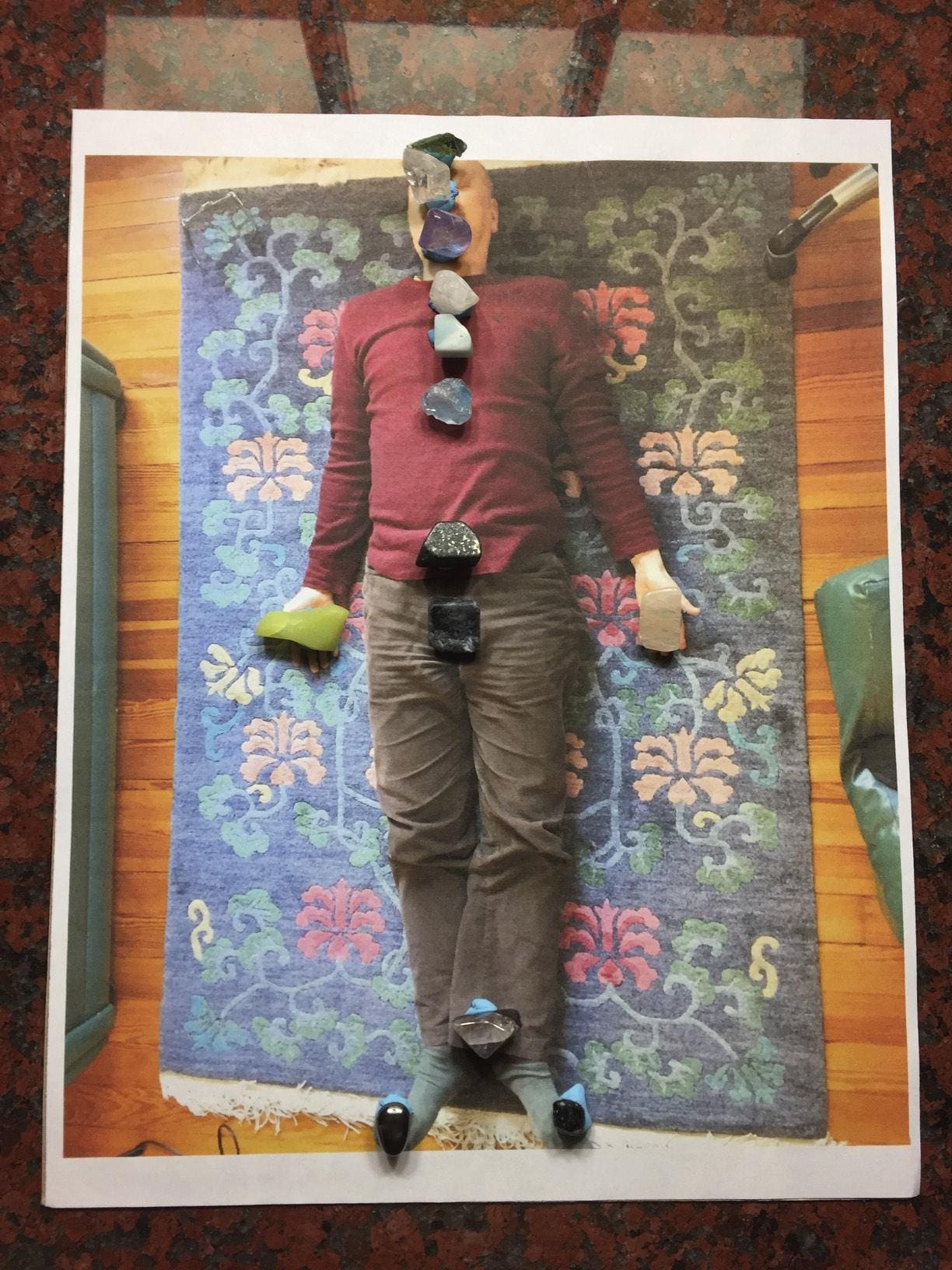 One was a “Photonic Treatment” (Robert’s term), in which we glued relevant stones to photos of oneself, which we’d brought to the event. This would engender alignment. This treatment could be used – like a voodoo doll – on any photo, to impart wellness and wholeness.