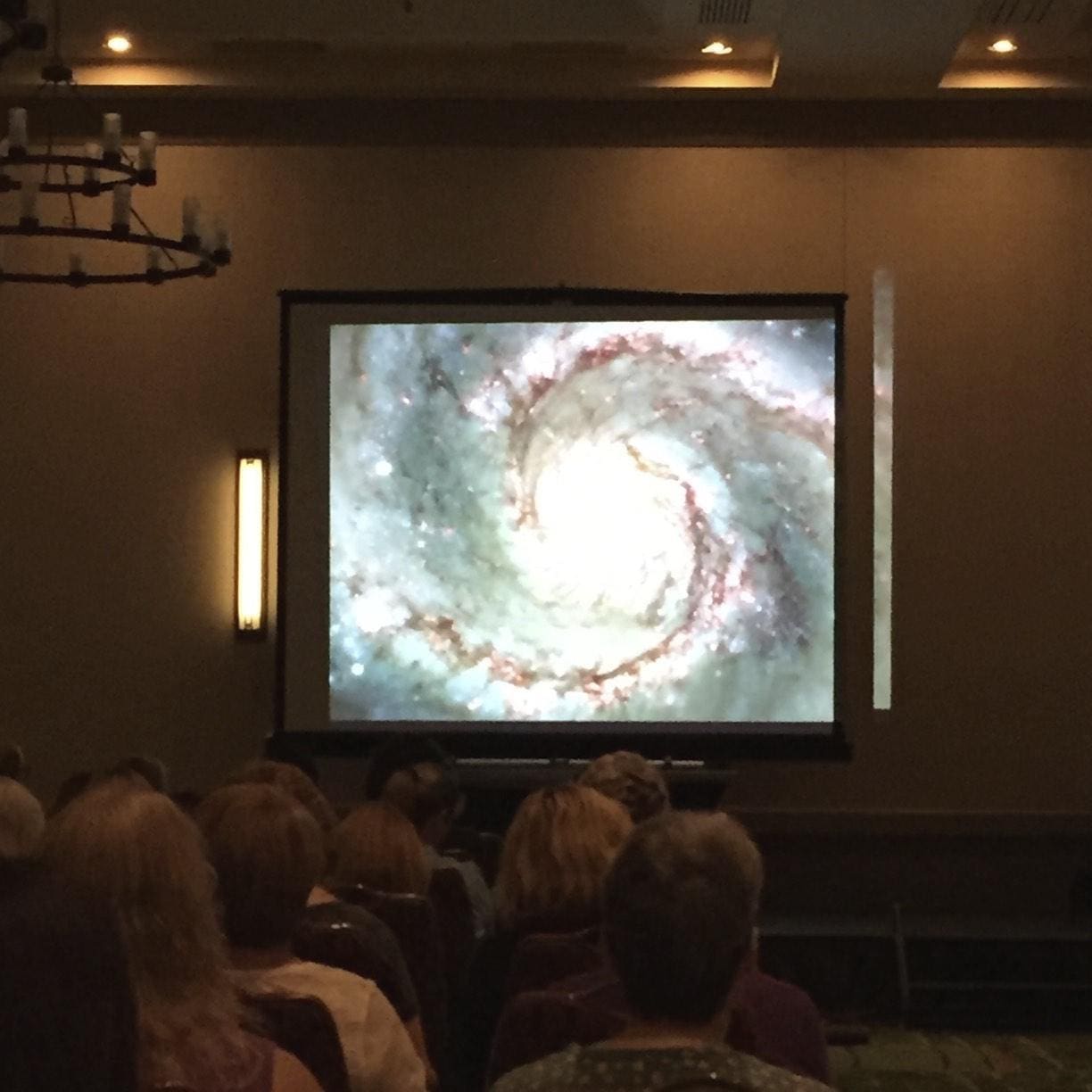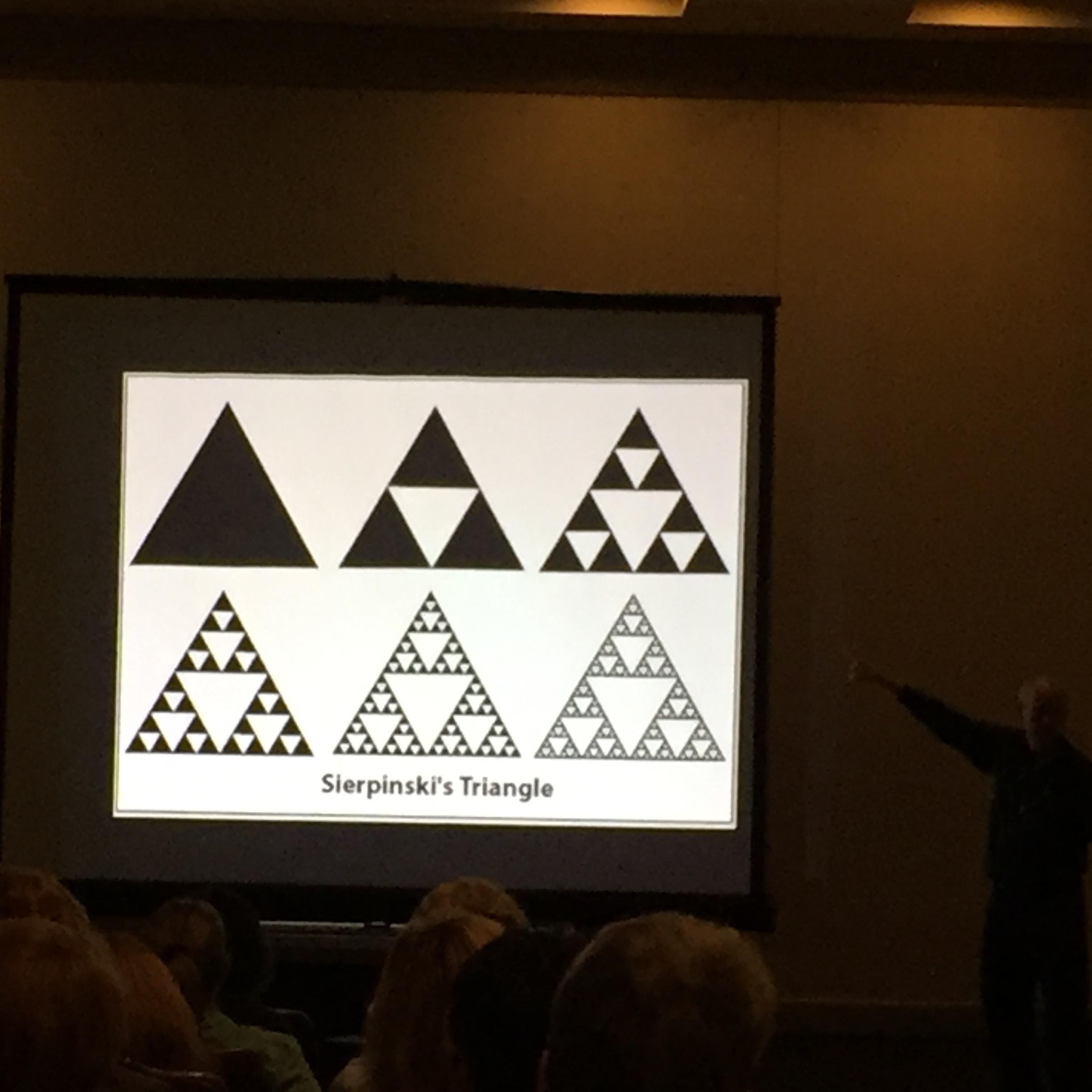 There was a foray into Fractal Geometry – a slide show (and even video) demonstrating that you can always divide things into smaller components (telescoping) – or zoom out to see the same patterns repeating. Examples on the small side include a shell or fern leaf unfurling (or the way our inner lung keeps splitting into smaller branches). This dynamic goes all the way up to the eye of a hurricane, and even the shape of a galaxy. They are all repetitions of Sacred Patterns (yes, we saw images of crop circles).