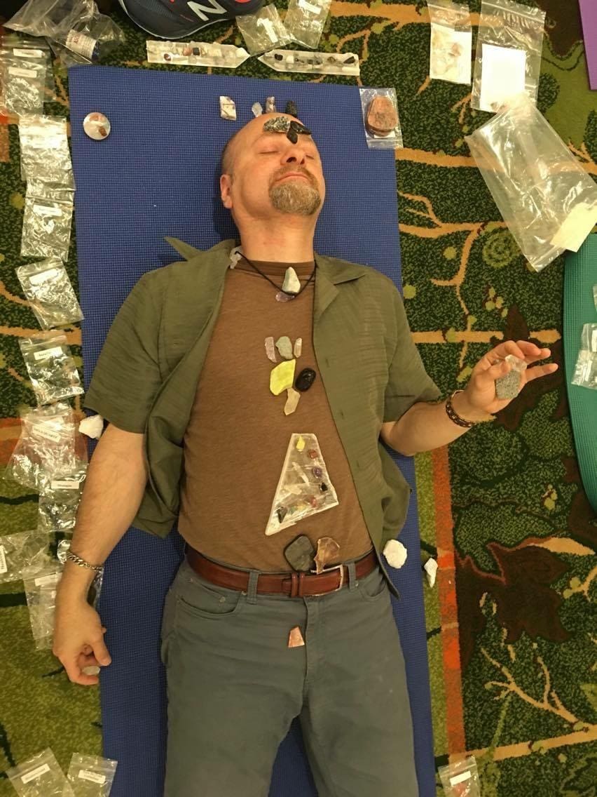 So we got right into using stones – choosing a partner (I was actually in a threesome!) – and we took turns rotating a crystal over the recipient’s head while also moving another up and down their spine. When “the work” was done, the “giver” brought the stones together over the person’s head, and drew them up and apart, as if signifying the manifestation & magnification of their (the stones & the people’s) collective energy (and intention). Someone asked if Robert had come up with this technique himself…he had.