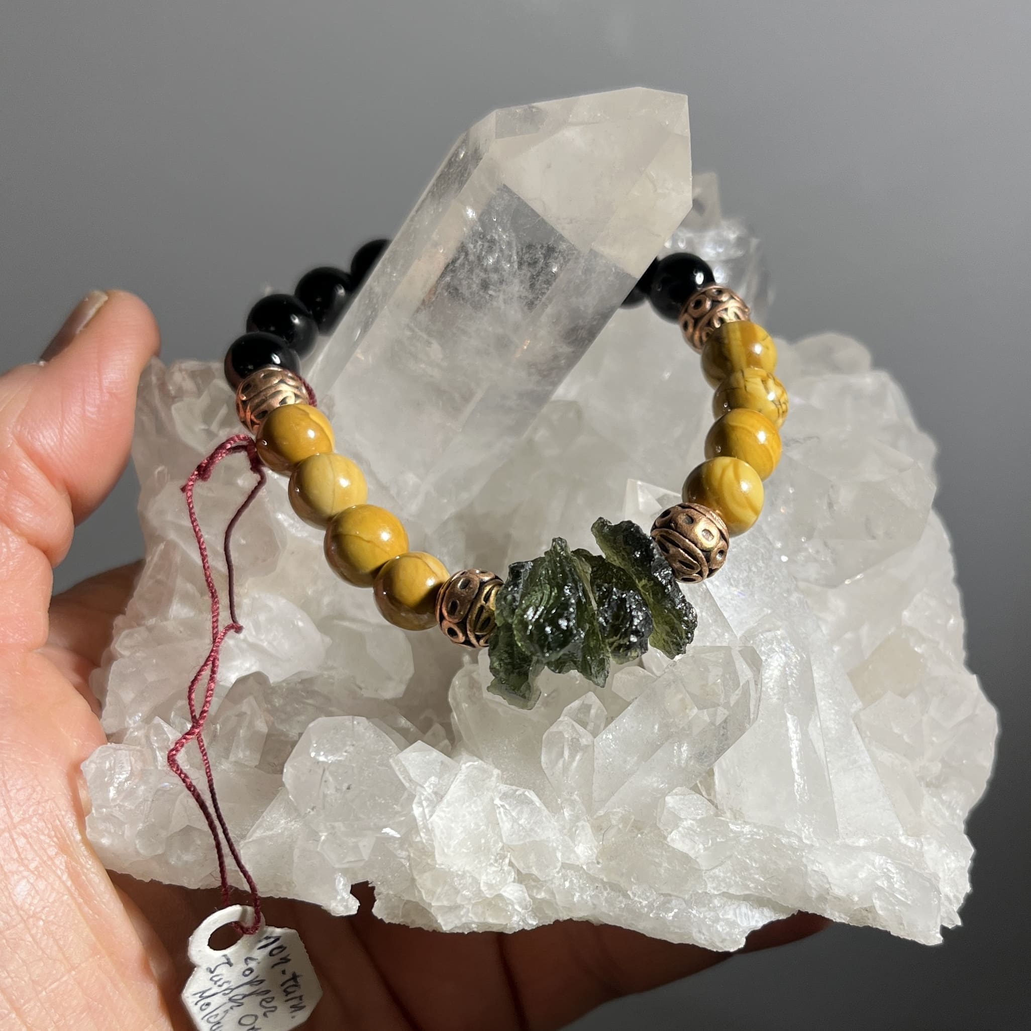 Gorgeous combo with yellow Picture Jasper, great color contrast. 4 drilled Moldavites, width designation means 6.25″ wrist size (Med to Sm). Longest individual bead length is 0.6 inches. They are authentic, natural Moldavite chunks or “crystals” – which are not common to find drilled anymore. Freshly restrung in ’26. We cannot guarantee the longevity of the stretchy bands used to string these beads, they generally have a life span, that is shortened with intensive use. Moldavite is the Alien Messenger Stone, a composite of Earth and Space materials resulting from a meteoric impact 15 million years ago. Width: 15.9cm Weight: 22.6g (.8oz) Origin: Europe (Czech Republic)