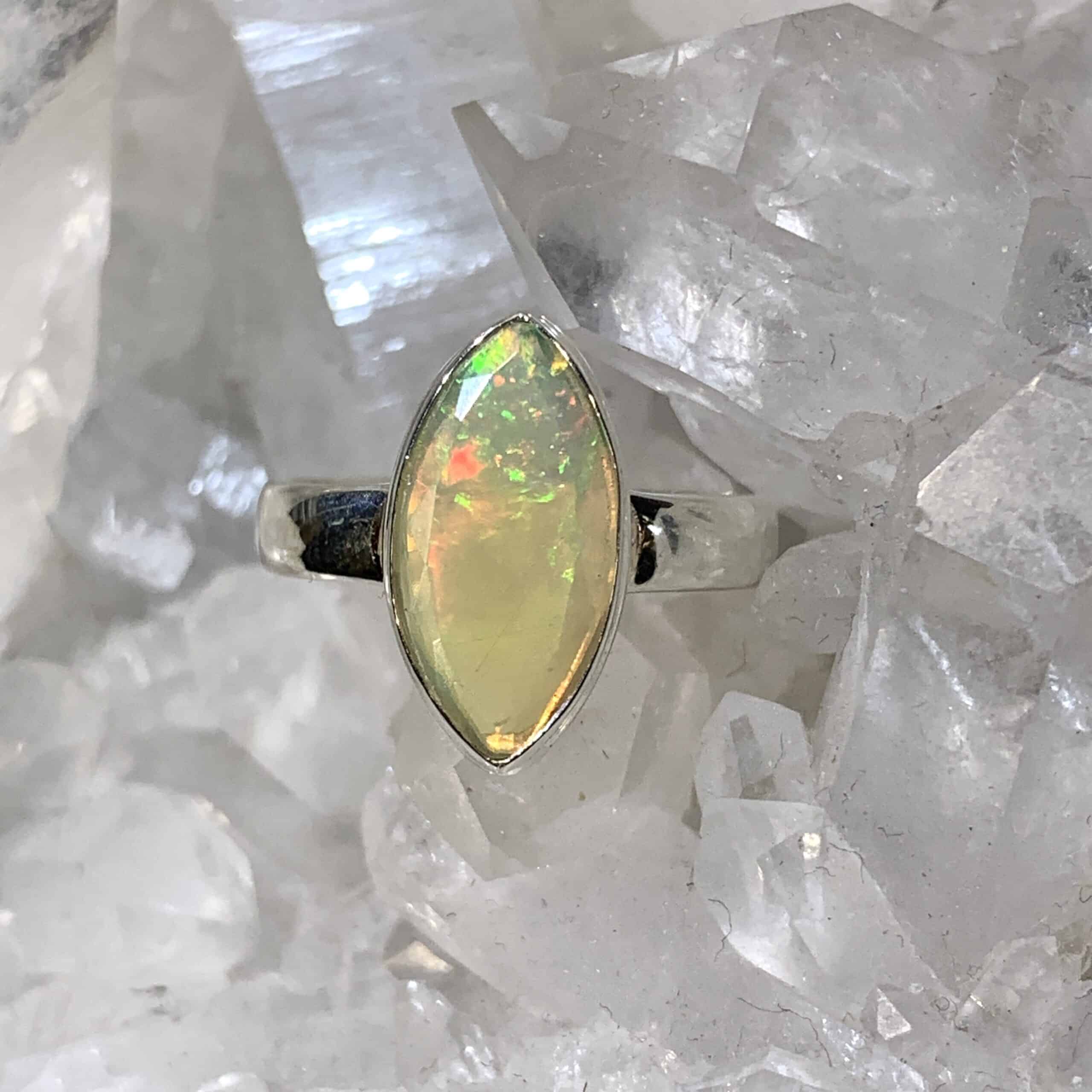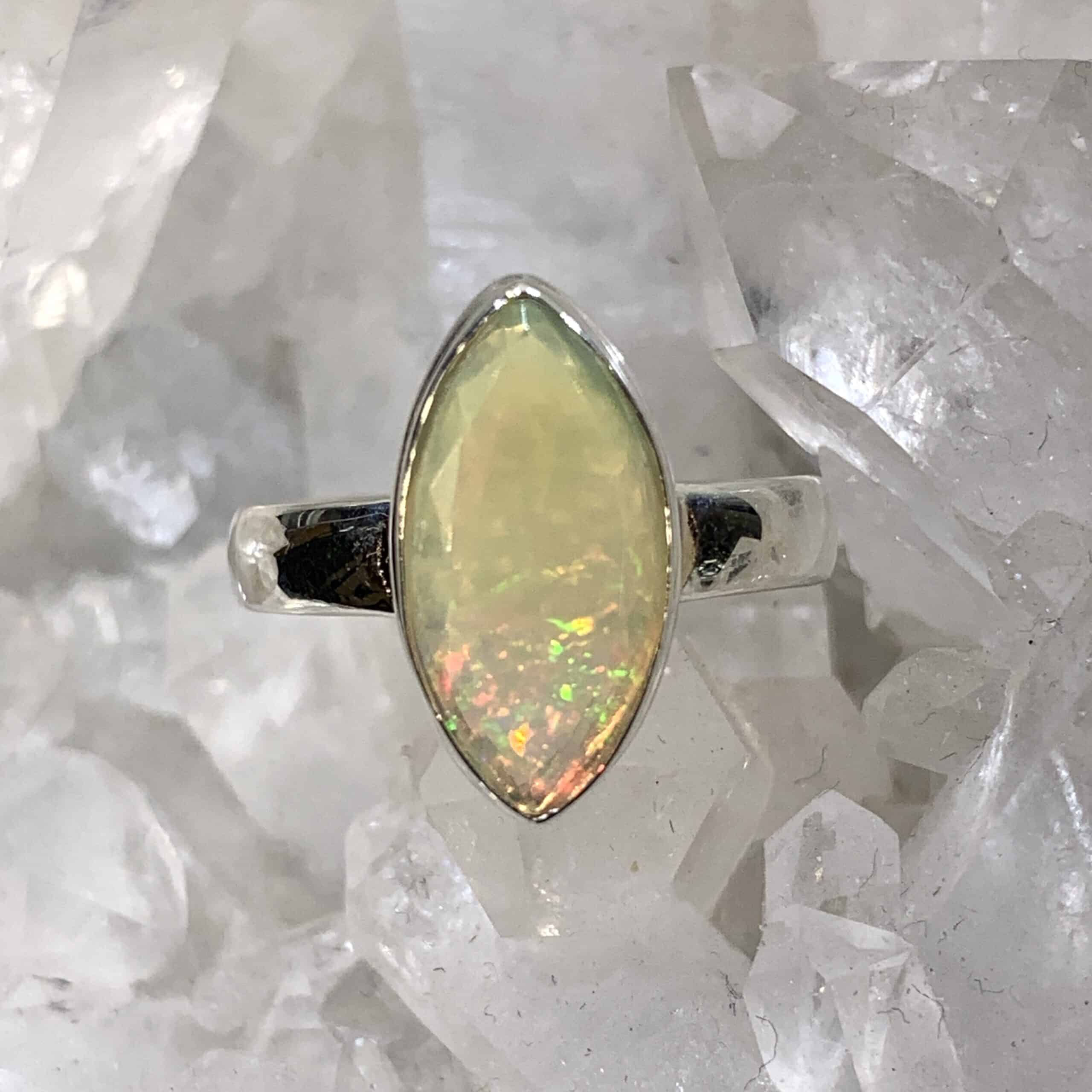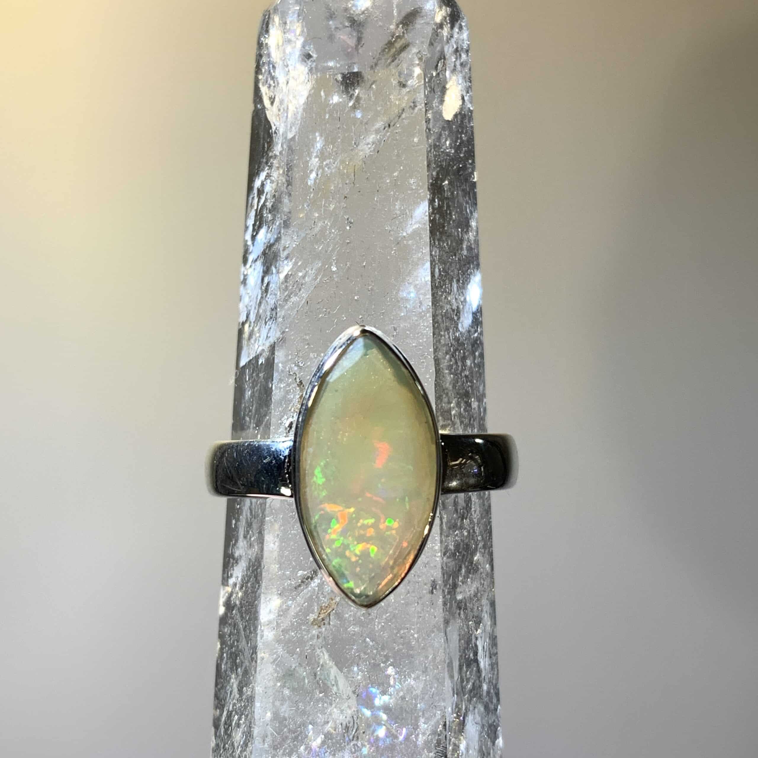 Beautiful creamy white Ethiopian opal marquise, with one particularly vibrant point with green, yellow, blue and red flashes. Set in a Sterling bezel and band, size 7. 15mm opal. Weight: 14ct
